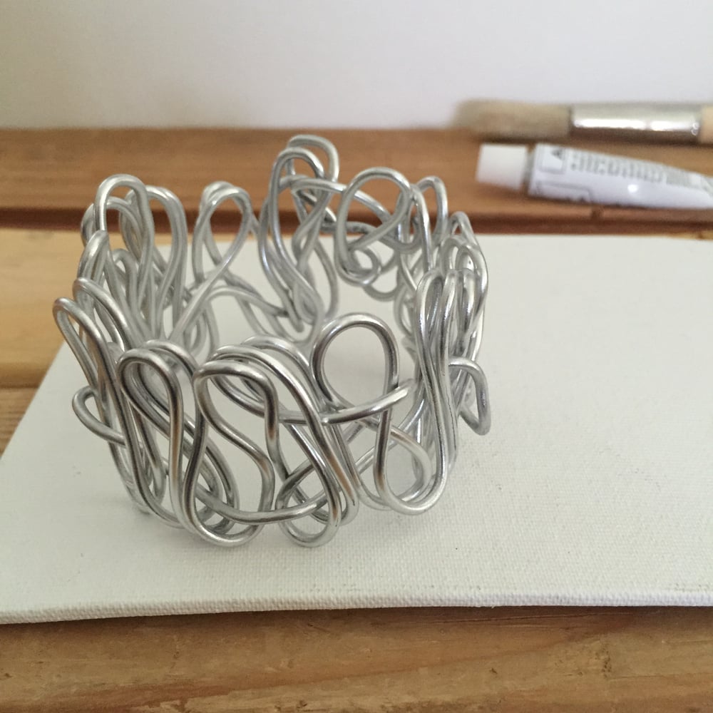 Tangled wire inspired by the movement of electricity. Adds energy and movement to boost your outfit. The aluminum wire makes it super lightweight. Stretch it evenly all the way around to enlarge it. Put it on your wrist and "scrunch" it down to tighten it. Measures approximately 2 1/4" in diameter. Email me for custom sizes at no extra charge.